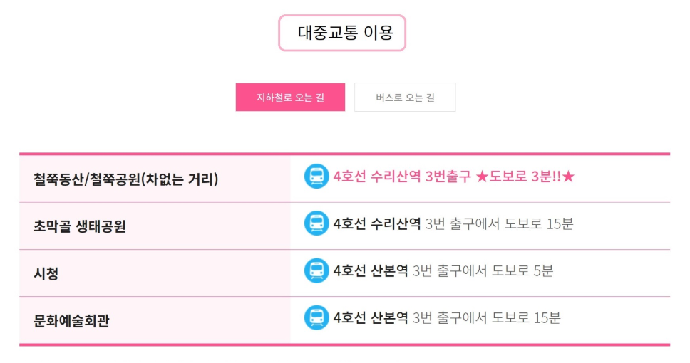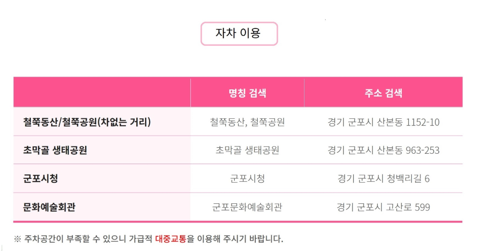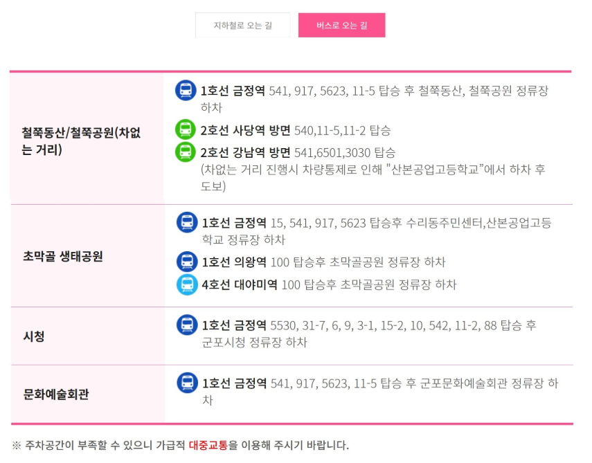 서울에서 전철로 약 40분, 강남에서는 버스로 50분 정도면 도착할 수 있는 군포는 수도권 어디에서든 부담 없이 당일치기로 다녀올 수 있는 거리에 있습니다. 특히 다른 유명 꽃 축제들이 대부분 교통이 불편한 지방에서 열리는 것에 비해, 군포철쭉축제는 지하철 역에서 셔틀버스로 바로 연결되니 대중교통 이용자에게도 큰 부담이 없죠.