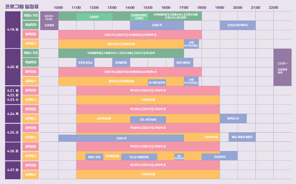 - 음악회 : 군포시민가요, 군포합창제, 꿈의오케스트라 '봄의 향연'
