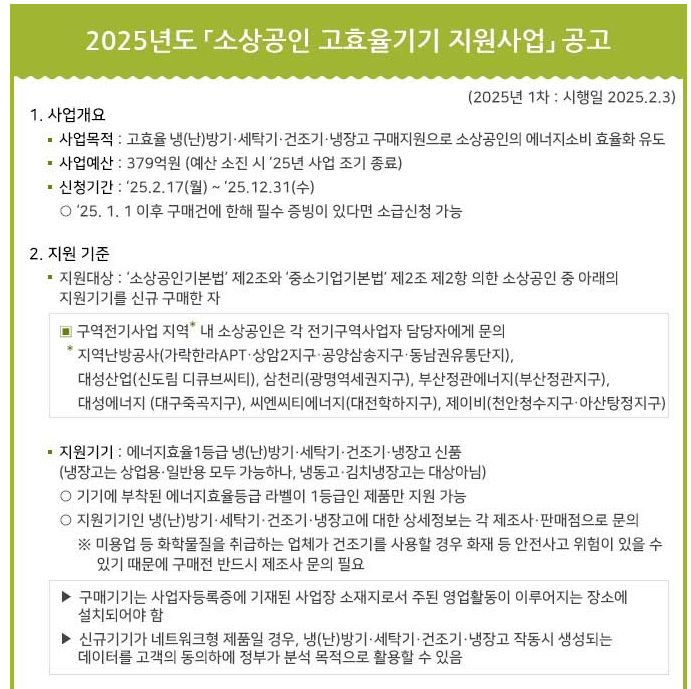 올해 사업명은 '2025년도 소상공인 고효율기기 지원사업'입니다. 혹시나 냉난방기 지원사업으로 이해하셔서 냉난방기만 되는지 오해를 하실까봐 정확한 사업명을 알려드려요. 2025년 소상공인 고효율기기 지원사업은 올해 1월 1일 이후 에너지 효율 1등급 제품을 구입하셨다면 지원금 신청이 가능해요.