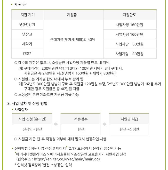 신청기간은 '25년 2월 17일부터 올해말까지이나 사업 에산 소집시 조기종료될 수 있어요. 소상공인 고효율기기 지원사업과 관련된 사항은 콜센터(1515-1212)으로 전화하시면 됩니다.