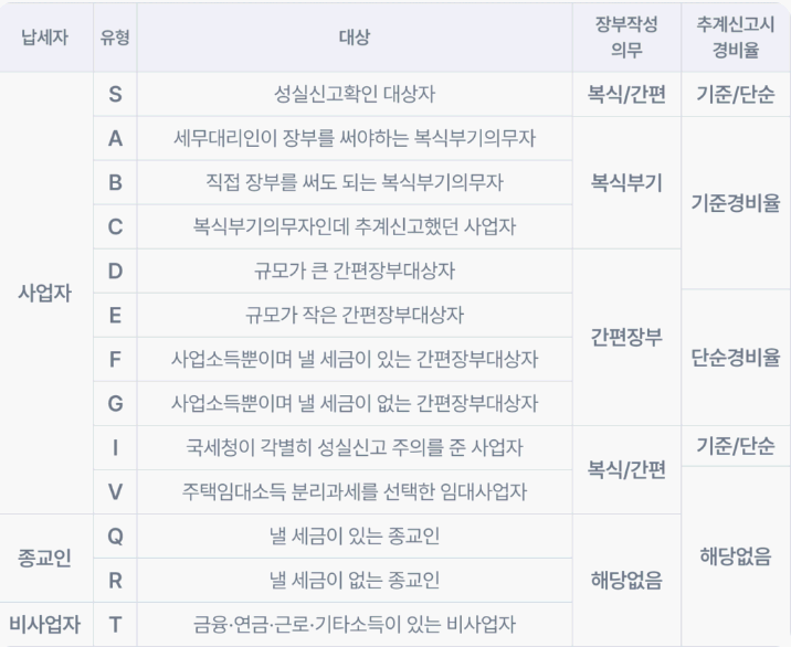 - S, A, B, C유형 : 복식부기의무자 유형이예요. 수입금액이 높은 분들이라고 할 수 있는데 이 경우 회계 및 세법 지식이 필요할 수 있어 세무사의 도움을 받으세요