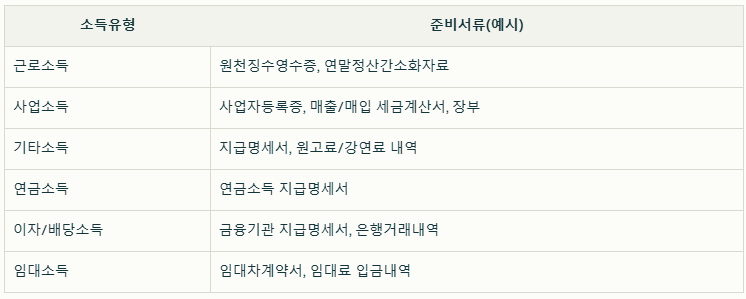 TIP : 소득유형이 여러개면 모든 소득별로 증빙자료를 준비하세요. 누락시 추후 가산세가 부과될 수 있어요.